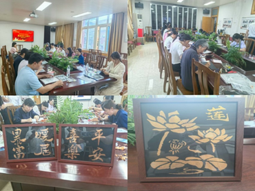 9月10 日下午1点半,学院306会议室摇身变成“小型手工工坊”。按照视频讲解,参会教师把人手一份的鎏金胶水、金箔、黑色卡纸以及亚克力模板一字排开。大家小心翼翼地用铅笔和亚克力模板在黑色卡纸上勾勒出美丽的图案,拿惯了粉笔的双手做起手工照样不含糊,一笔一画彰显环建人细致踏实的作风。随后认真涂上胶水,轻轻地把金箔纸粘贴上去。一边制作,大家一边探讨教学科研的心得体会,整个“小型手工工坊”充满了浓浓的节日气氛。最后一步是把多余的金箔擦掉,精美绝伦的鎏金手工画就跃然纸上。大家互相分享,争先恐后地和自己的作品合影留言。