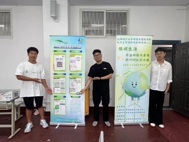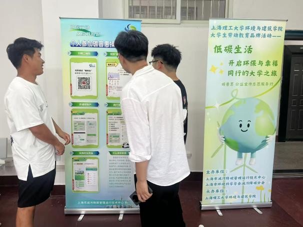 迎新报道现场,bwin必赢联合上海环境学会、减污降碳中心在新生迎新中融入大学生劳动教育品牌活动——碳普惠教育,旨在通过专业教育与低碳实践相结合,为“双碳”目标培养具有生态文明素养的新时代环境人才。