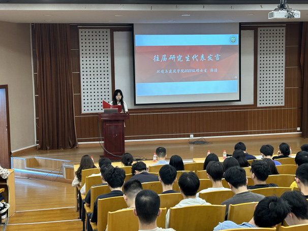 2023级环境科学与工程专业研究生陆洁作为往届学生代表发言。她分享了自己在科研项目、学科竞赛及社会实践中的成长故事,从“如何高效阅读文献”“怎样与导师有效沟通”“如何平衡科研与生活”等实用角度,为新生提供了具体建议,鼓励学弟学妹们勇于跳出舒适区,主动拥抱挑战,在解决实际环境问题的过程中实现自我价值。
