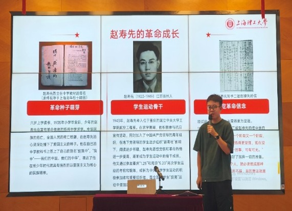 活动伊始,研究生党员通过珍贵的历史照片和详实的史料,将小同学们带回了那个风雨如磐的年代。一百年前,赵寿先出生于中国近代史上最动荡、最复杂也最充满希望的时期,他的信仰就是抗日救国。他曾执教于上海国立高级机械职业学校,即BWIN官网复兴路校区的前身,他投身革命洪流,在艰苦卓绝的斗争中,将个人生死置之度外,最终献出了年仅25岁的宝贵生命。他牺牲后,精神并未远去,嗣子赵训善接过了信仰的火炬,他花费数十年时间,搜集整理伯父的革命事迹,将零散的记忆碎片和历史文献拼凑成完整的英雄篇章,让先烈的故事得以续写和流传。此后,侄孙赵征又通过撰写和发表红色文章等方式,让赵寿先烈士的精神跨越时空,触达了更广泛的年轻群体。三代人,身处三个截然不同的时代,他们传承信仰的方式从抛洒热血、秉笔直书到网络发声,形式在变,但那份对党忠诚、为国为民的赤子之心,却始终如一,熠熠生辉。